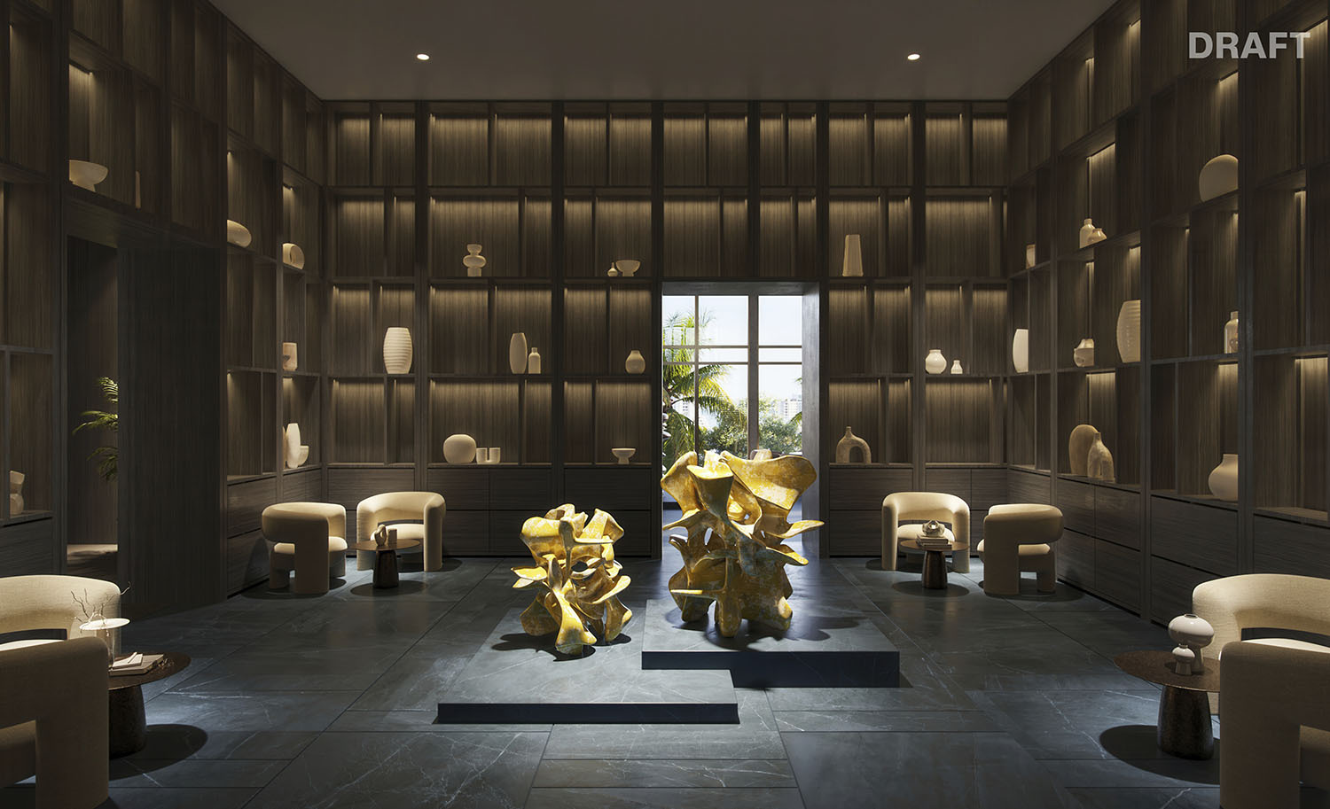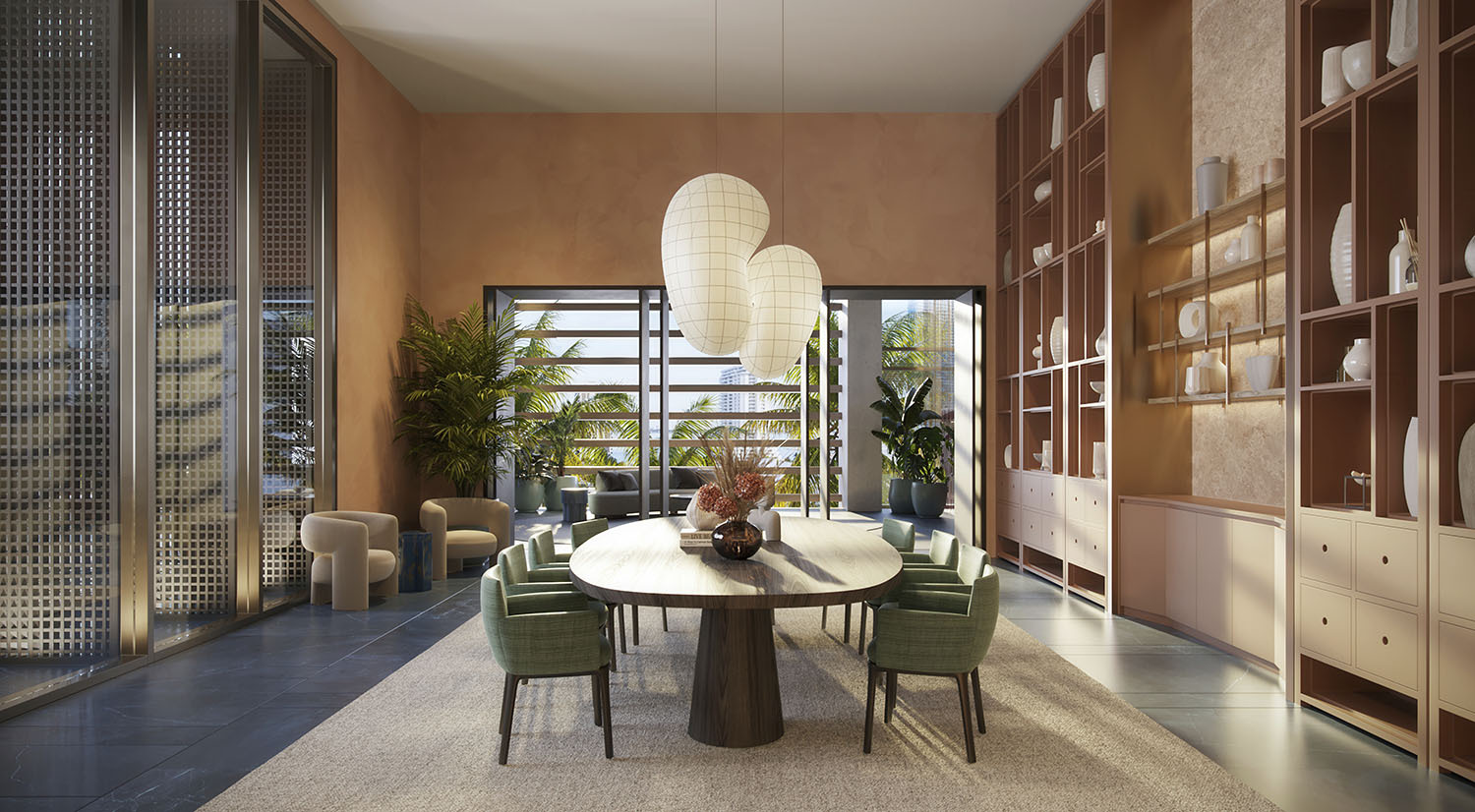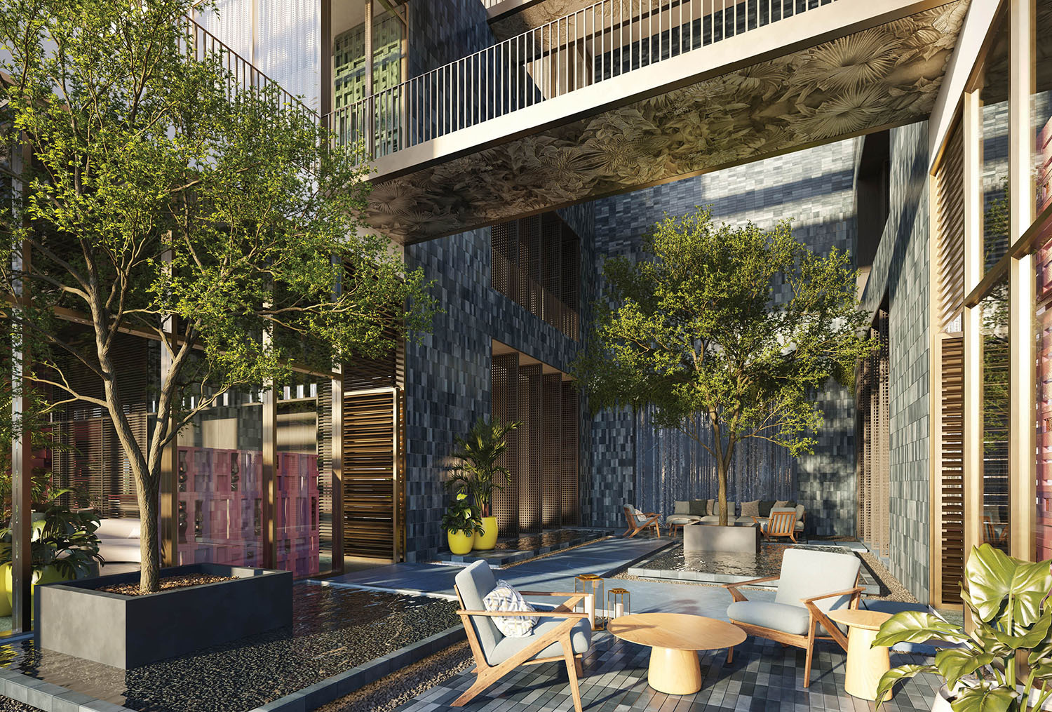 • Lobby and amenity levels by Yabu Pushelberg, immersed in CLAD-designed tropical landscaping and sculpture gardens.