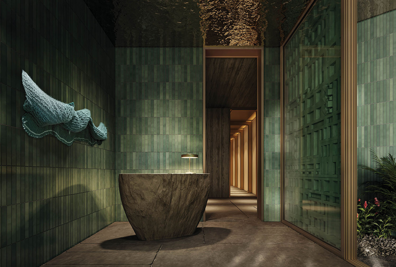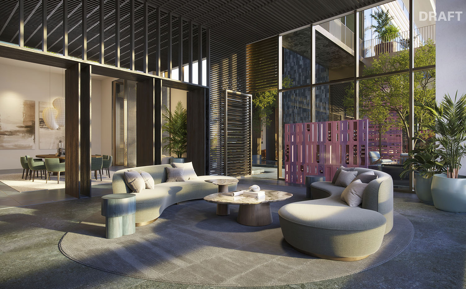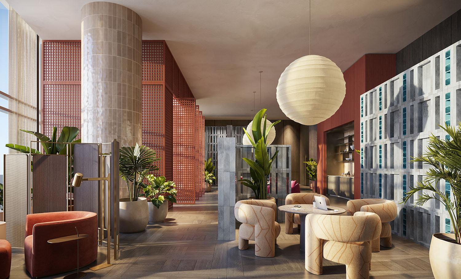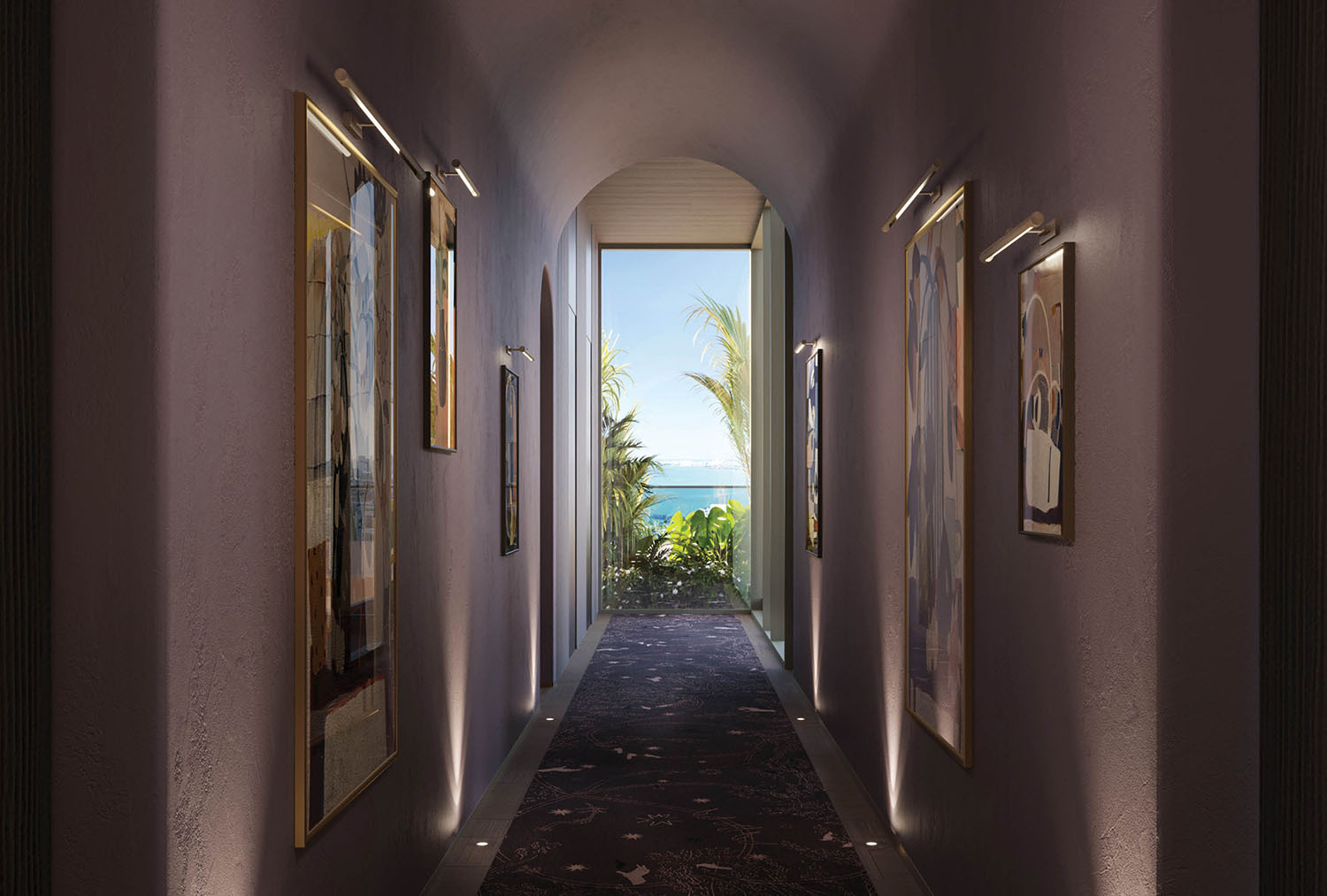 • Lobby and amenity levels by Yabu Pushelberg, immersed in CLAD-designed tropical landscaping and sculpture gardens.